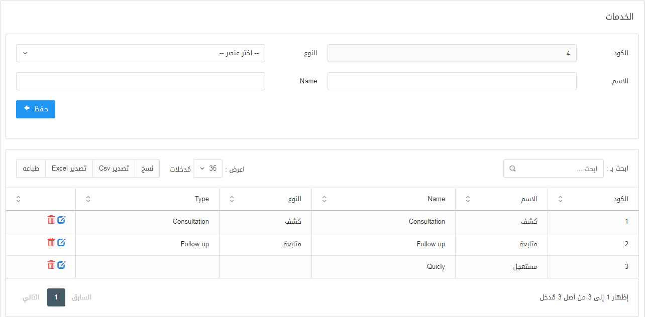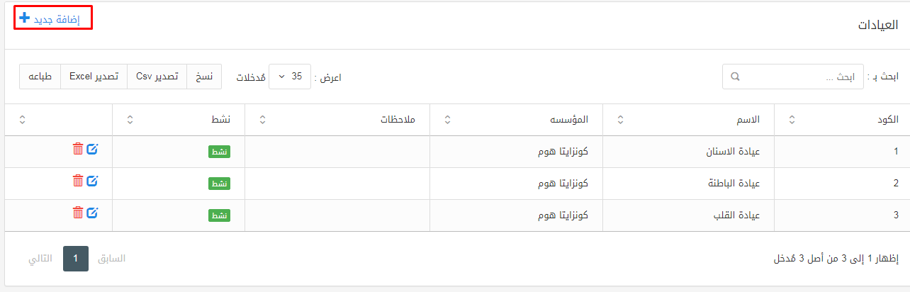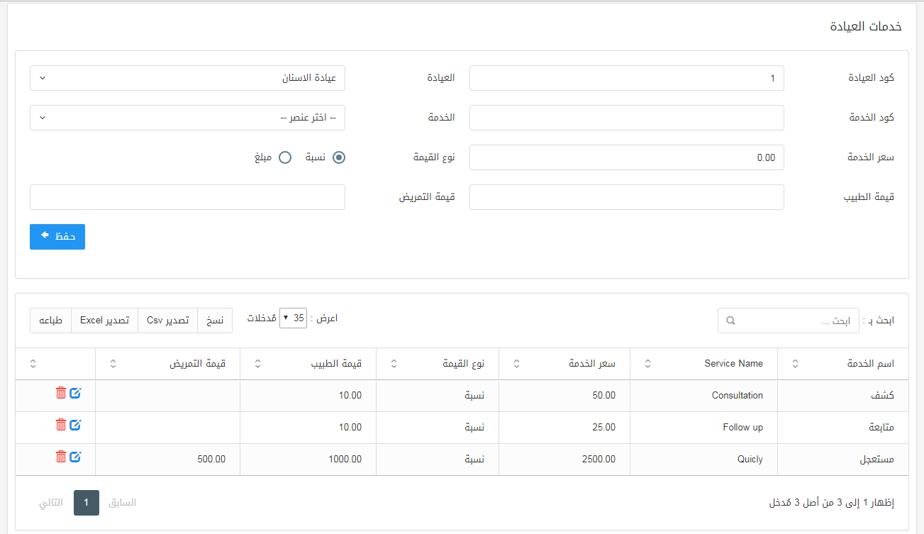 - العيادات: إضافة العيادات وربط الأطباء و الممرضين و الخدمات فيها كما هو موضح بالصور.