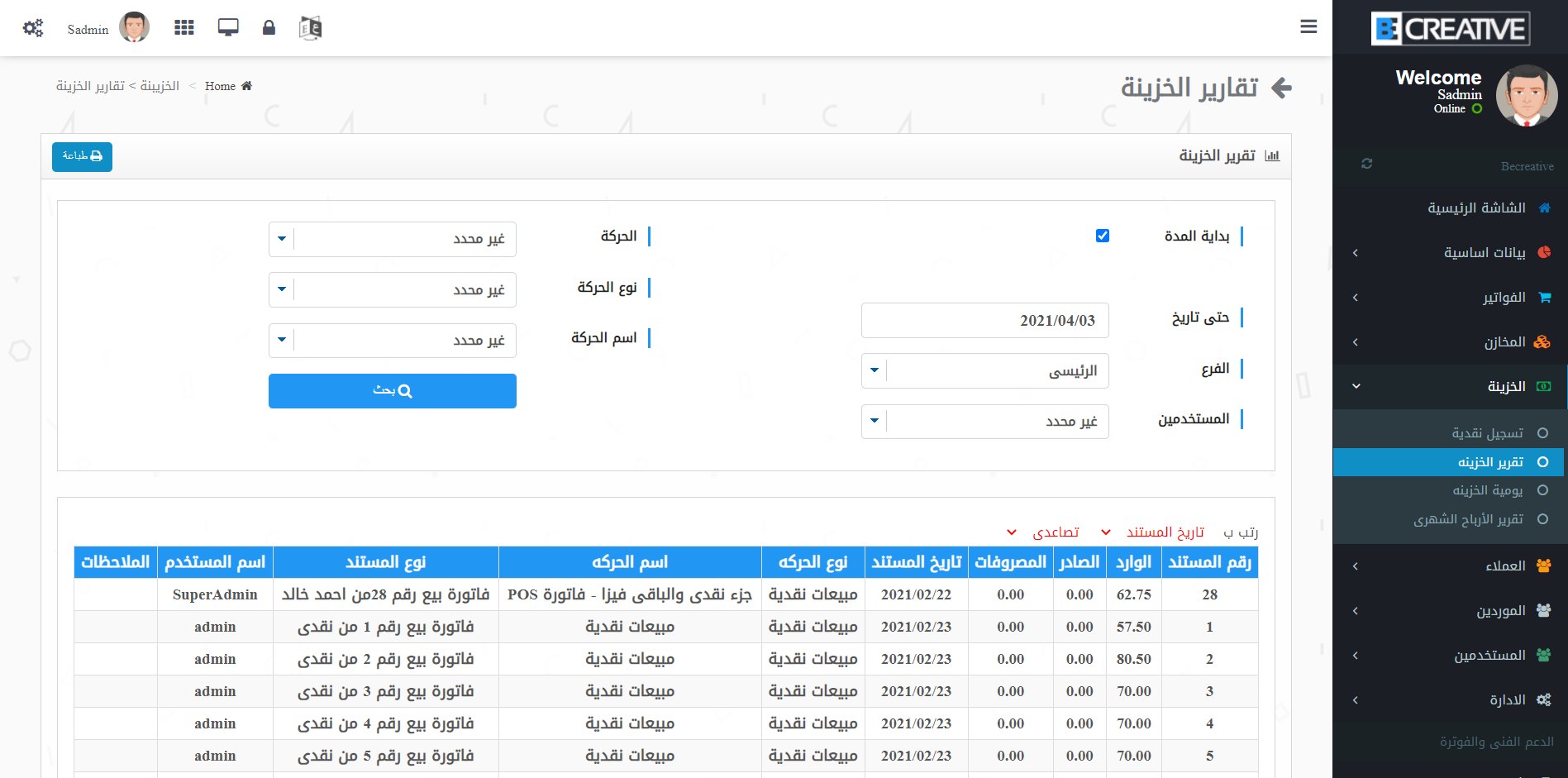الخزنة : ( تسجيل النقدية _ تقارير الخزنة _ تقارير الارباح والمصروفات والخسائر وصافى الربح ) وهذه القائمة هى المسؤلة عن تسجيل المصروفات والايرادات وكل مايخص الخزنة وتقاريرها .